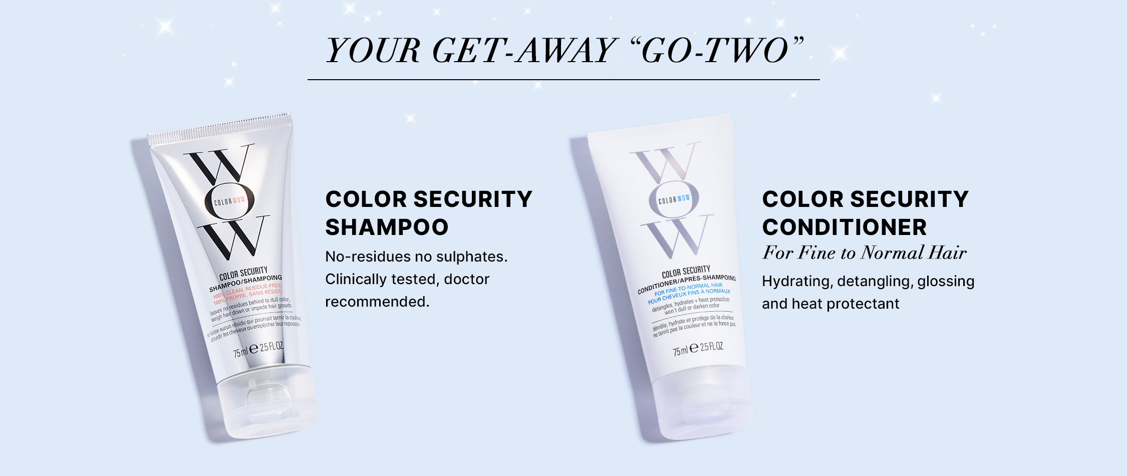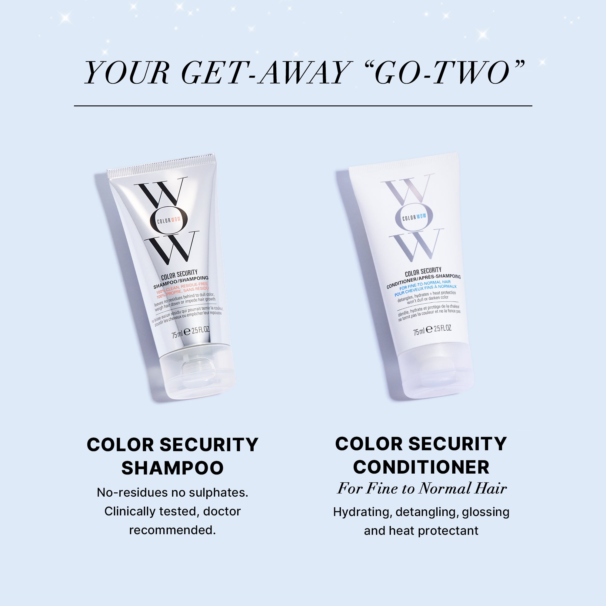 Color Security Shampoo (2.5 fl oz) - Unique 100% clean, residue-free formula contains none of the typical shampoo ingredients (silicones, conditioning agents, thickening agents) that don’t rinse out - Leaves nothing behind that will dull hair, weigh it down, or block follicles (which can cause thinning or hair loss) - Keratin-safe, extension-safe, perfect for all hair types - Prevents color fade - Sulfate-free, silicone-free, paraben-free, cruelty-free Color Security Conditioner (For Fine to Normal Hair) (2.5 fl oz) - Gently detangles, smooths + hydrates - Will not yellow, darken or distort color - Non-greasy, won’t weigh hair down - Heat protectant - Paraben-free, cruelty-free, sulfate-free, gluten-free, vegan