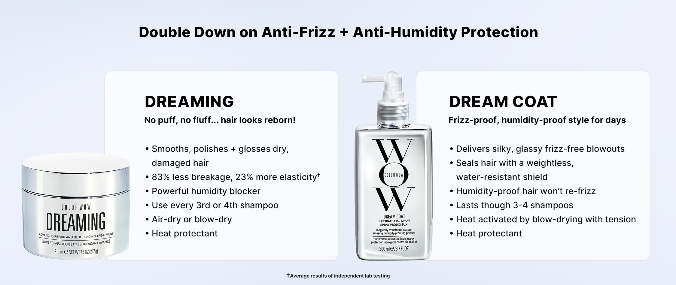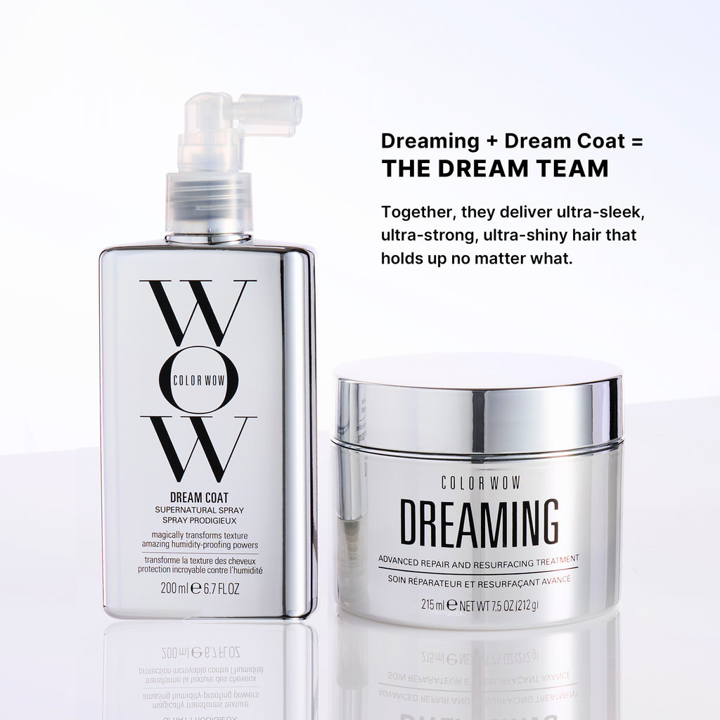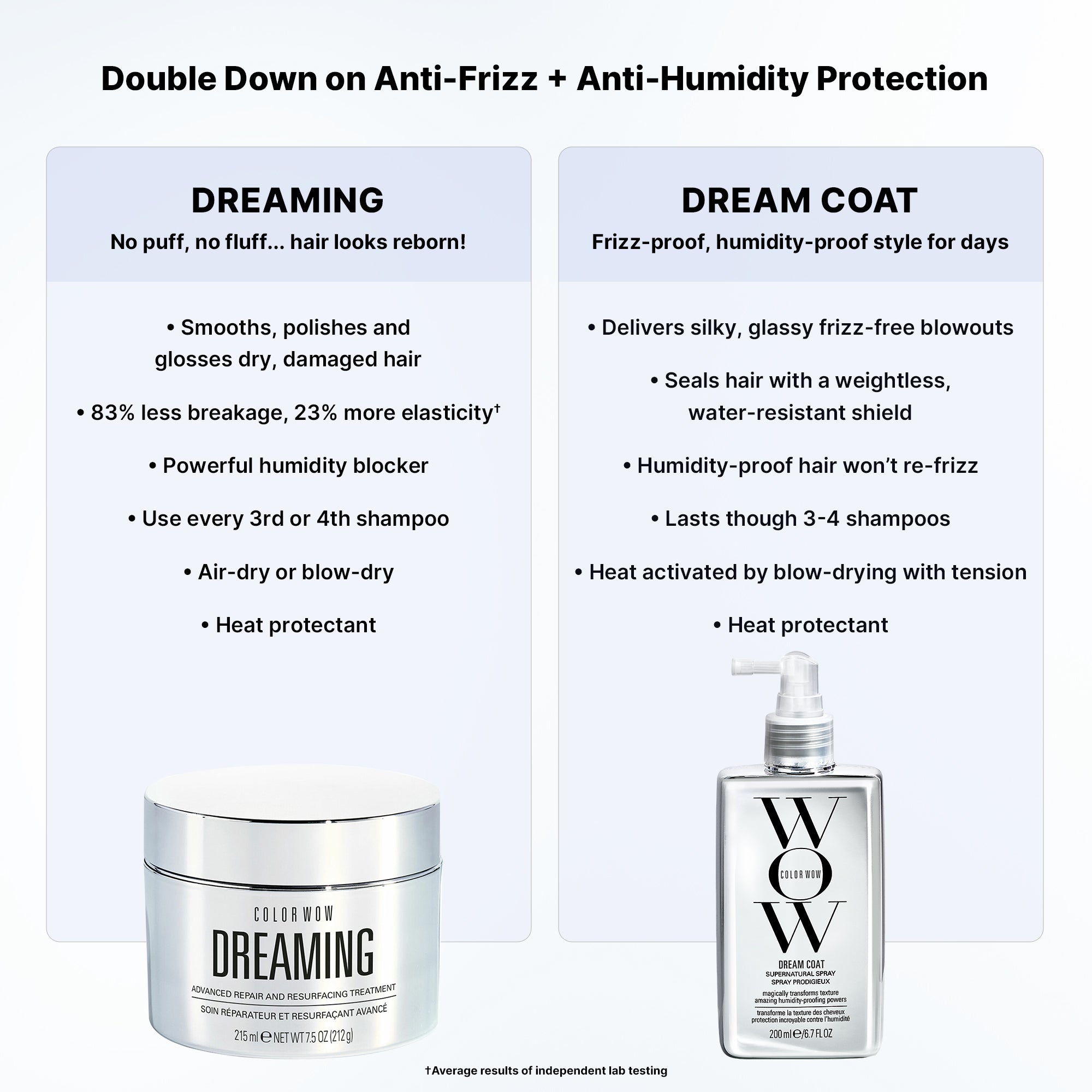 Absolutely. Use Dreaming first as your in-shower repair + smoothing treatment, then follow with Dream Coat on damp hair before blow-drying for frizz-free, humidity-proof style that lasts.