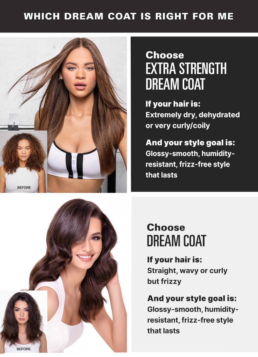 If you have wavy to curly hair and want to style it smooth and sleek, we recommend the original Dream Coat Supernatural Spray, and if you have coily and/or dehydrated hair and want a smooth, sleek, frizz-proof style, we’d recommend using Extra Strength Dream Coat.