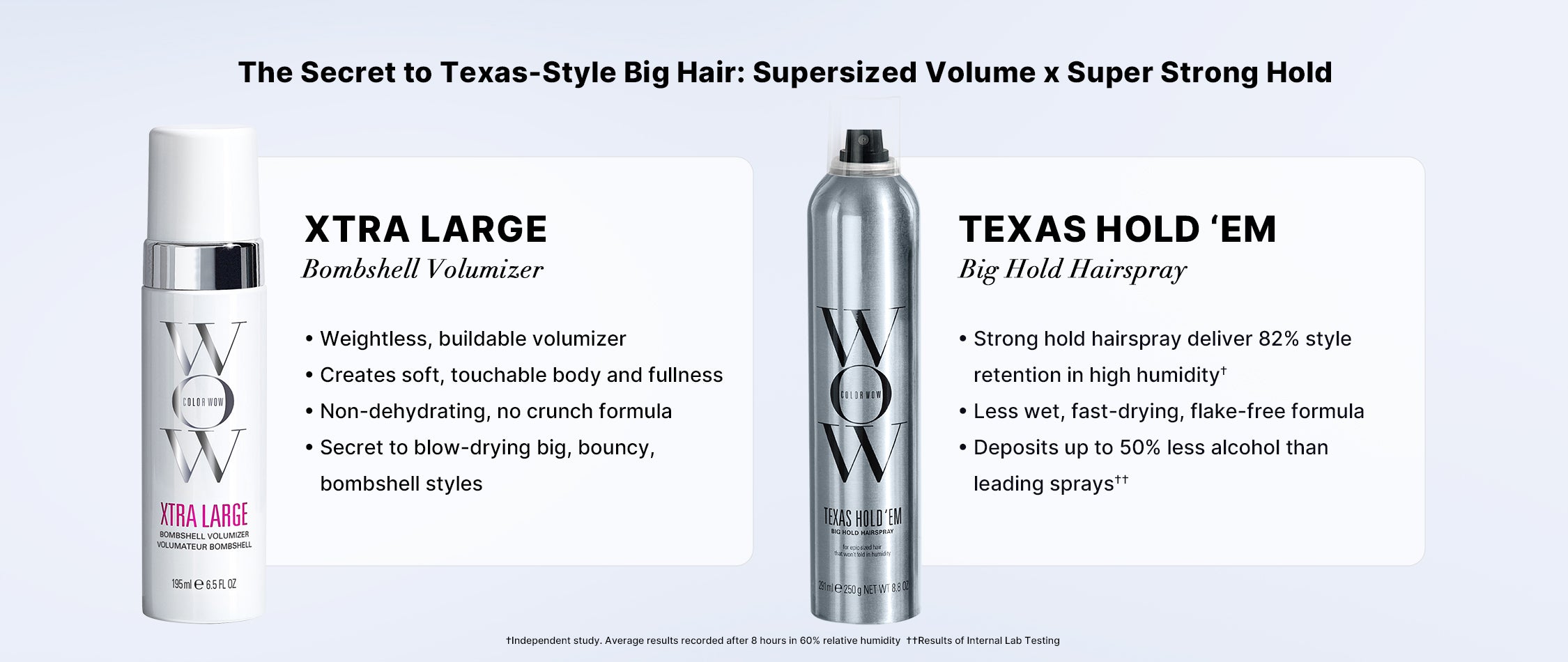 Shake Texas Hold ‘Em Big Hold Hairspray well and direct spray to each roller about 10 inches away. “Less wet” spray formula dries instantly to lock in big voluminous waves.