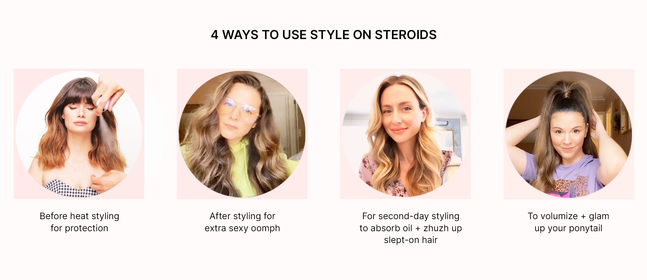 Four square images showing different uses for Style on Steroids hair product.
